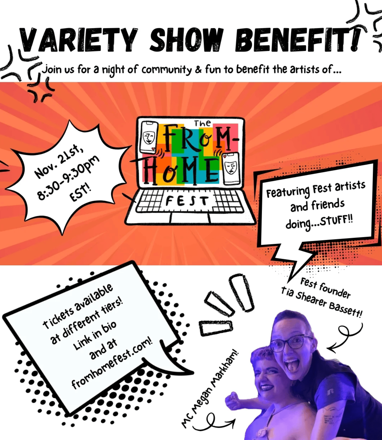 This Friday, November 21, From-Home Fest artists will perform an online VARIETY SHOW BENEFIT to help raise money for the artists performing in the third annual From-Home Fest.